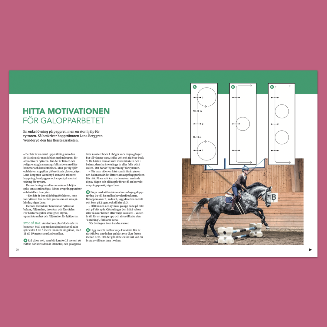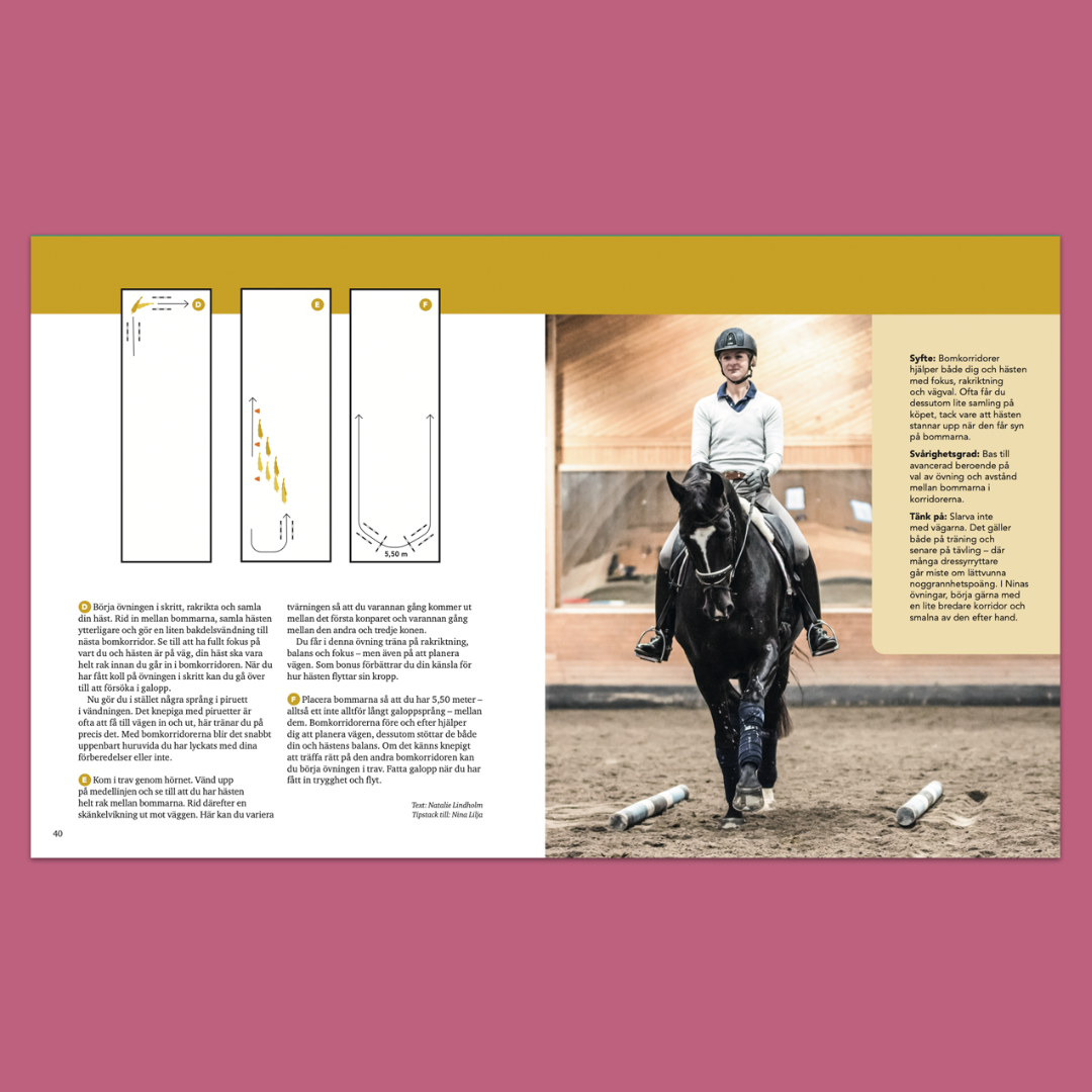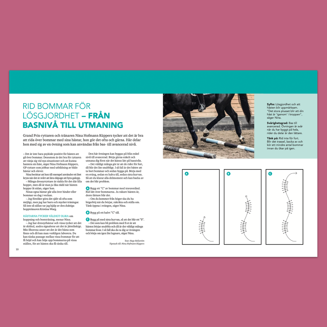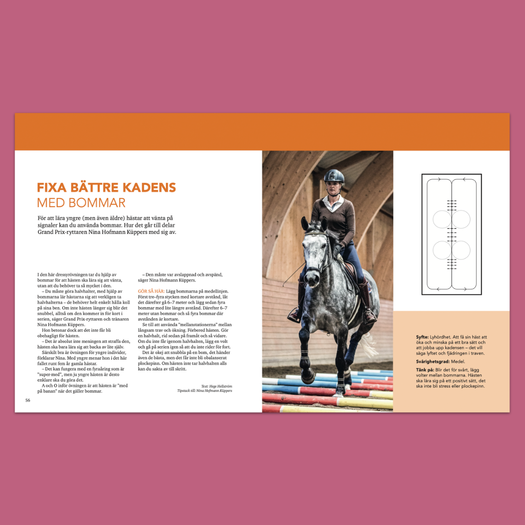 Vi har samlat 31 inspirerande bomövningar från vårt sajt- och tidningsarkiv till denna bok, övningarna är fördelade på 20 separata artiklar som vi hoppas och tror ska komma till stor praktisk användning. Som med alla Hippsons träningshäften är formatet i boken smidigt, den kan med fördel förvaras i stallskåpet och plockas fram när du behöver lösa ett konkret problem eller ”bara” vill boosta träningsglädjen.